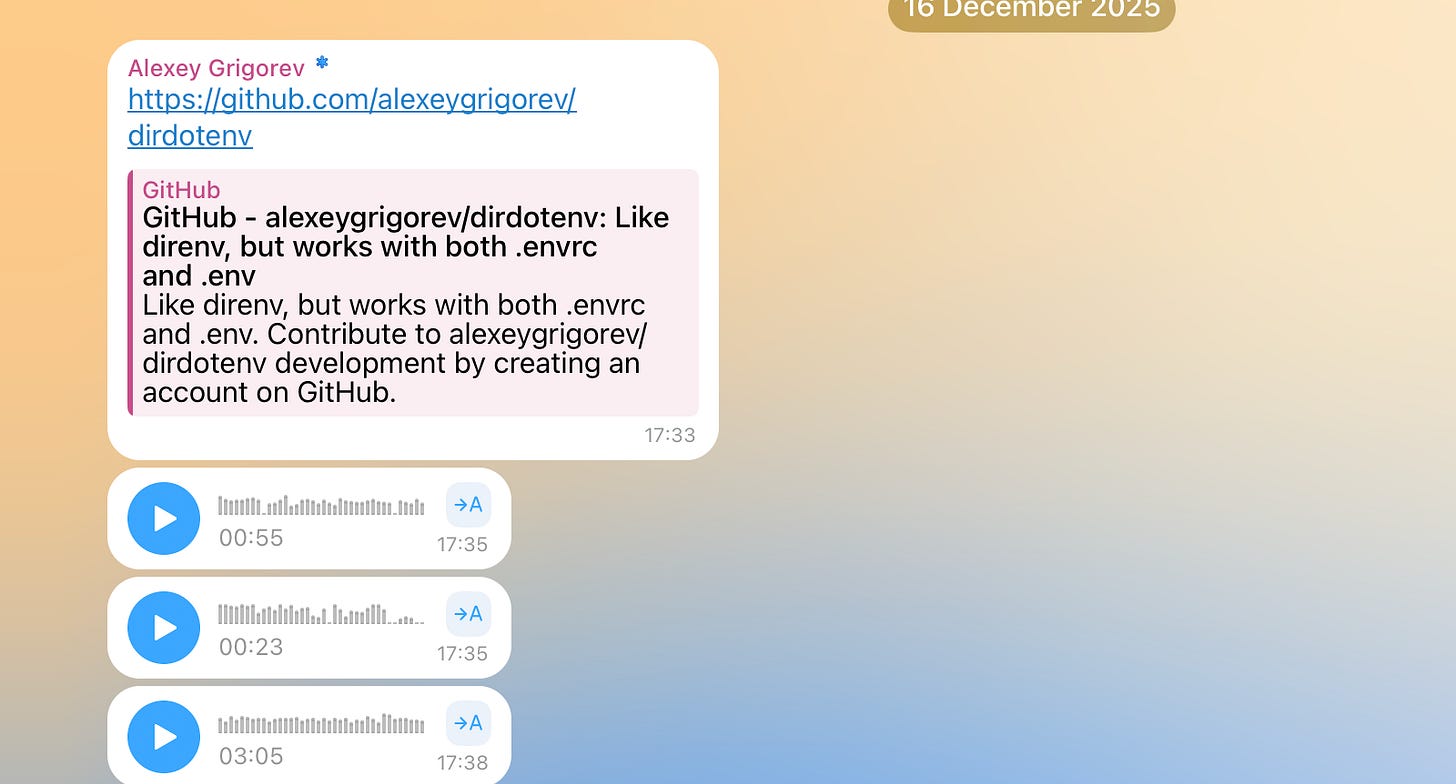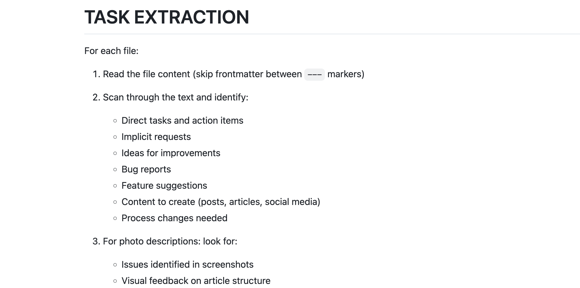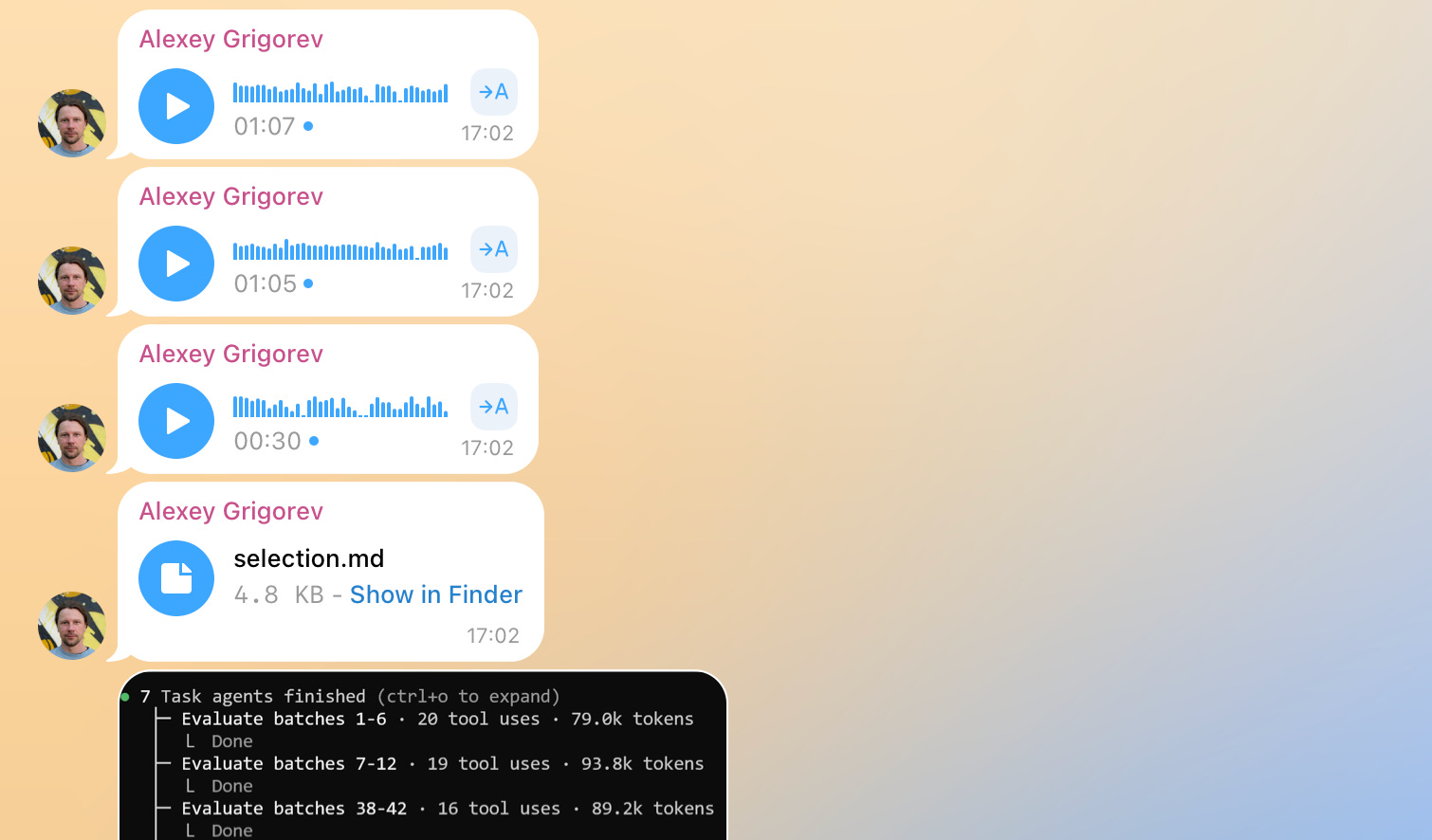 If I need the agent to update its configuration, including the system prompt and the code it’s based on, I can record improvement ideas as voice notes in the same chat. I can also add images if necessary. I then run the /check-tasks command. The assistant processes all the messages in the chat and looks for bug reports, feature suggestions, etc. After that, it updates the prompt or code accordingly, and commits updates to the repository.