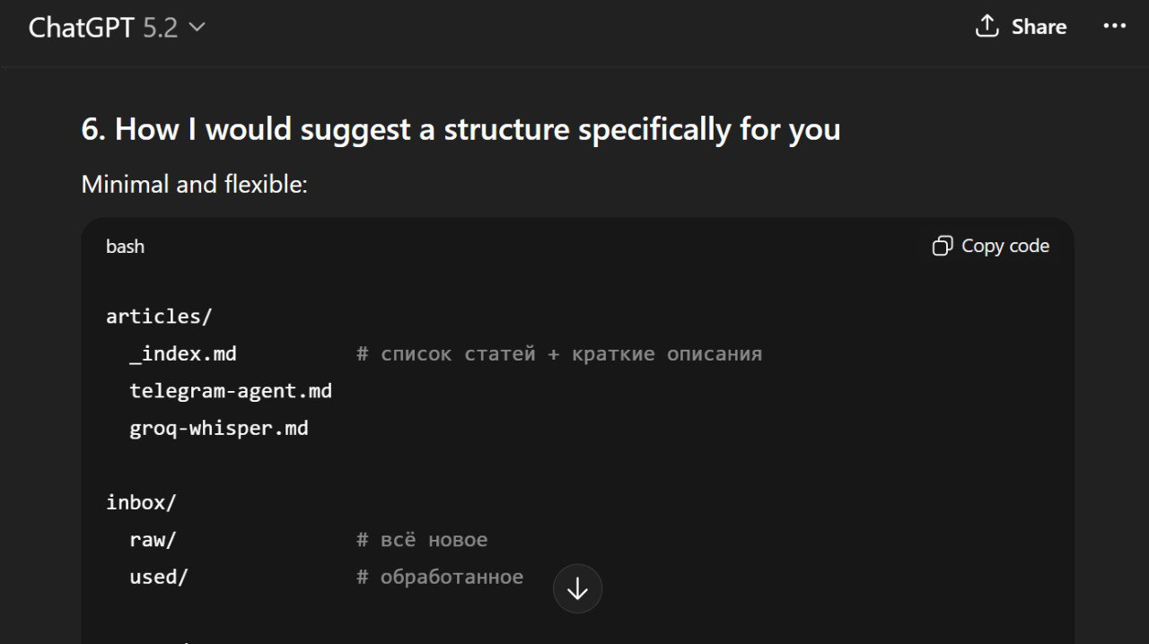 I recorded voice messages, discussed the workflow, and refined the process description until it was clear enough to write down. At the end, I asked ChatGPT to save our conversation as a summary.md file, which became the system specification. It was initially in Russian, but I translated it into English for you.