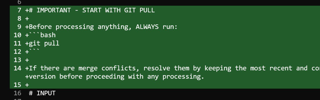 All updates are committed to a GitHub repository. Each processing run results in a concrete diff that shows exactly what changed. The agent can also follow natural-language instructions such as running git pull before processing to ensure it is working with the latest state.